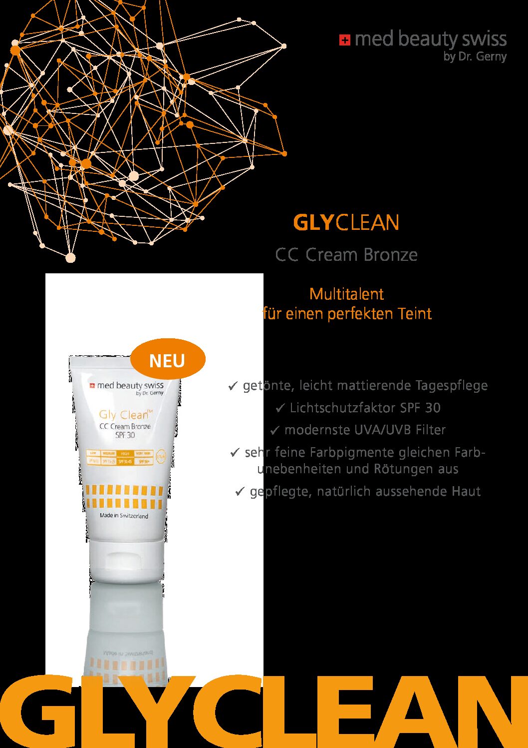 Die getönte, leicht mattierende Tagespflege GLYCLEAN CC Cream Bronze SPF 30 gleicht mit ihren sehr feinen Farbpigmenten Rötungen und Farbunebenheiten auf der Haut aus. Die Creme, mit Lichtschutzfaktor SPF 30, sorgt für einen gepflegten, natürlich aussehenden Teint. GLYCLEAN CC Cream Bronze erfügt über modernste UVA/UVB Filter und schützt so die Haut mit einem hohen Lichtschutzfaktor.